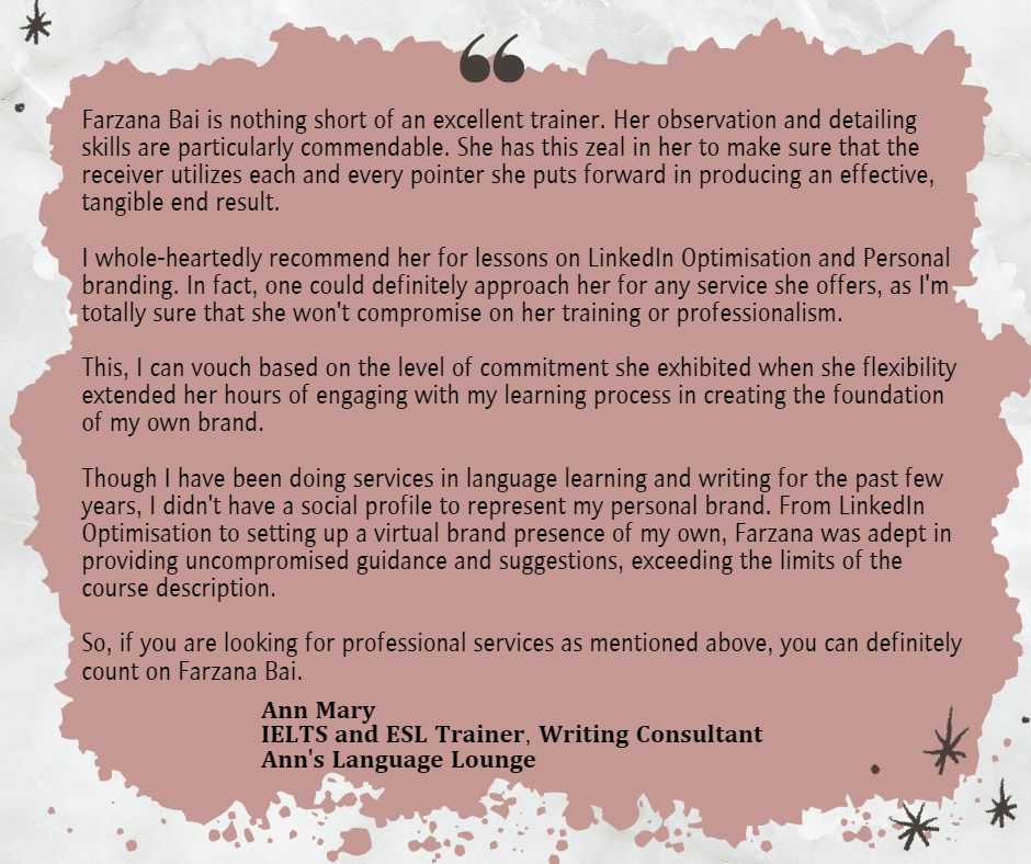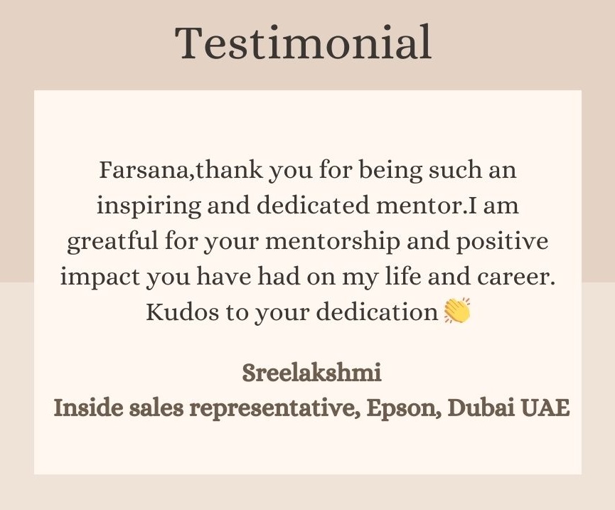 I work as a trainer for corporates, professionals, and young learners, and provide services for career transformation. I believe that every client deserves a tailored path to success, where their unique needs and aspirations are met. Here are the testimonials from some of the clients I’ve had the privilege to work with.